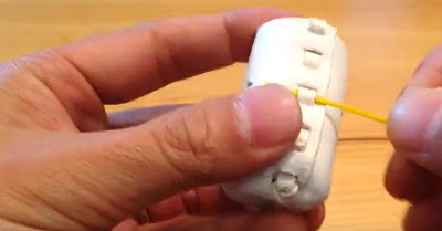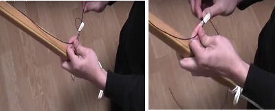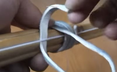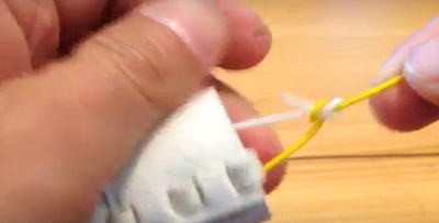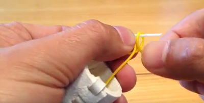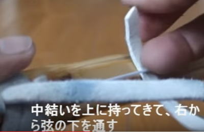 白いほうの弦を折り返して黄色い弦の最初作った輪に通します。